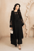 An elegant black chiffon ensemble adorned with intricate thread embroidery and delicate sequin accents. The fluid silhouette and sheer embroidered sleeves create a graceful, elongated look, while the subtle shimmer adds depth and sophistication. Paired with cropped culottes and an embroidered chiffon dupatta.