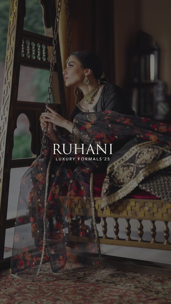 A black silhouette touched with golden and bronze detailing, completed with an embroidered palazzo trouser and an organza floral dupatta with embroidery that lifts the entire look.