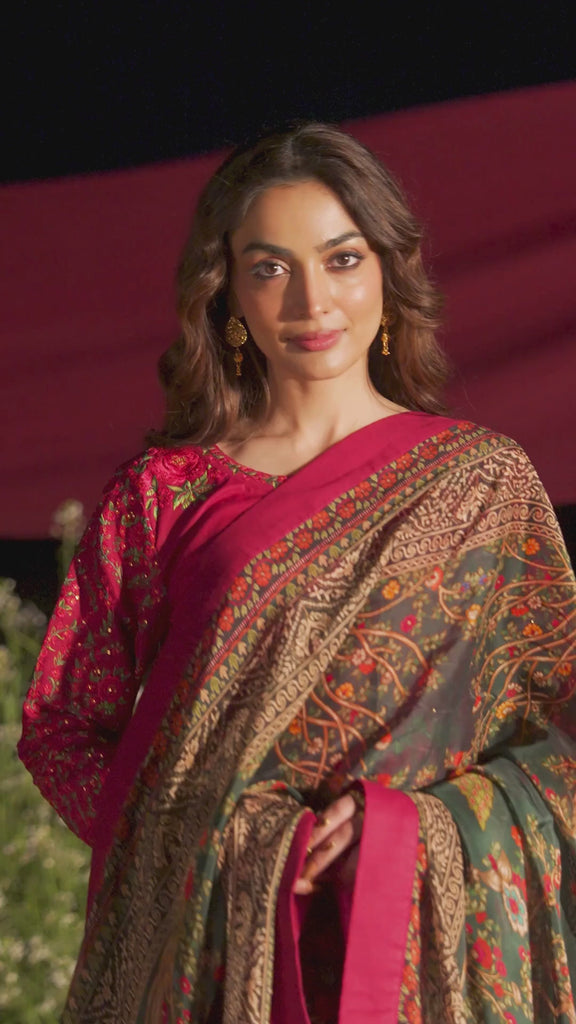 A vibrant magenta shirt, adorned with intricate pink floral embroidery and soft green accents, paired with matching trousers, while the silk dupatta shines with delicate motifs and along its edges — an ensemble full of rich details and refined charm.