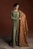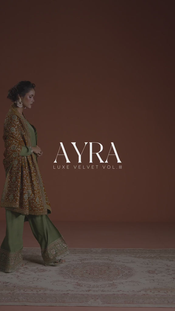A finely crafted ensemble in olive green and burnt orange, adorned with intricate embroidery and soft textures, radiating subtle charisma and effortless elegance, paired beautifully with silk pants and a velvet shawl that adds the most regal finish to the ensemble.