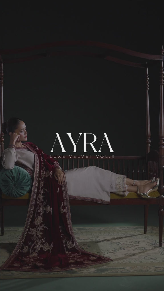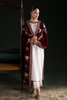 A striking ensemble woven with intricate details and rich textures, exuding refined charisma and subtle allure, paired gracefully with embroidered silk pants and a velvet shawl that adds a touch of regal charm.