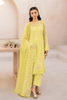 A luminous lime chiffon ensemble adorned with delicate thread embroidery in an all-over botanical motif. The fluid silhouette is complemented by a sheer, gracefully draped dupatta and embroidered trousers, creating an ethereal yet polished presence. Fresh, refined, and effortlessly elegant for elevated day and evening affairs.