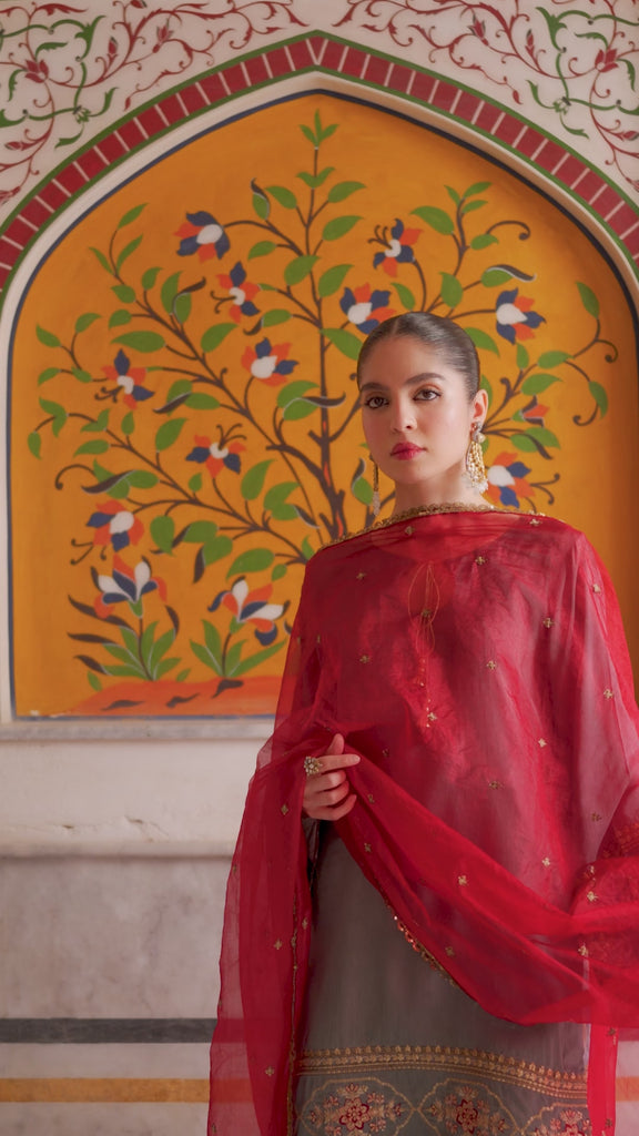 A classic beauty with its embroidered front and back, combined with delicately dyed sleeves on Bamber Raw Silk. The sharara, crafted with fine embroidery, adds a traditional touch, while the organza dupatta offers the perfect finishing flourish for a refined look.