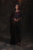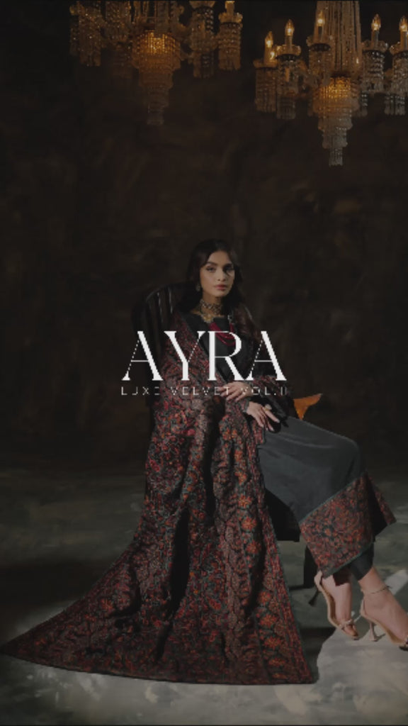 Minimalism meets elegance in Soraya, made from premium Bamber Raw Silk with a plain front, back, and sleeves. The embroidered patti for the daman and sleeves, paired with a luxurious embroidered velvet shawl, adds a regal touch to this timeless outfit.