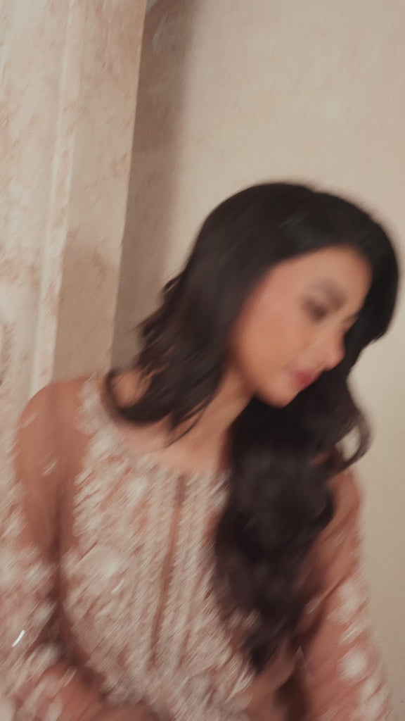 A refined mocha chiffon ensemble enriched with intricate ivory thread embroidery and subtle sequin detailing. The graceful silhouette combines a short shirt with a farshi shalwar and  is paired with a flowing, embellished dupatta, creating an air of effortless sophistication. A timeless expression of elegance, designed for elevated occasions.